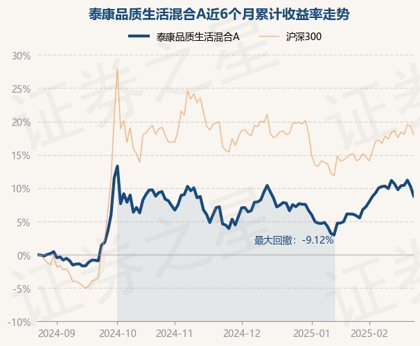 证券之星消息,2月25日,泰康品质生活混合A最新单位净值为1.144元,累计净值为1.144元,较前一交易日下跌1.3%。历史数据显示该基金近1个月上涨1.91%,近3个月上涨4.17%,近6个月上涨8.8%,近1年上涨10.46%。该基金近6个月的累计收益率走势如下图: