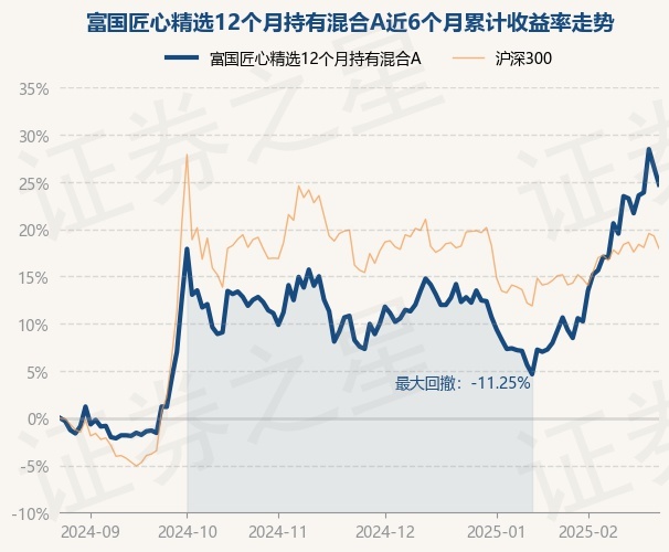 证券之星消息,2月25日,富国匠心精选12个月持有混合A最新单位净值为0.7868元,累计净值为0.7868元,较前一交易日下跌1.47%。历史数据显示该基金近1个月上涨12.8%,近3个月上涨15.94%,近6个月上涨24.73%,近1年上涨28.98%。该基金近6个月的累计收益率走势如下图: