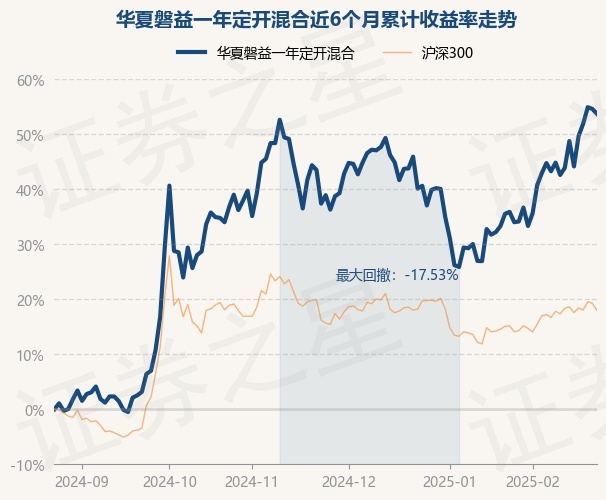 证券之星消息,2月25日,华夏磐益一年定开混合最新单位净值为1.192元,累计净值为1.251元,较前一交易日下跌0.58%。历史数据显示该基金近1个月上涨12.45%,近3个月上涨10.65%,近6个月上涨53.71%,近1年上涨46.1%。该基金近6个月的累计收益率走势如下图: