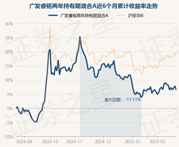 证券之星消息,2月25日,广发睿铭两年持有期混合A最新单位净值为0.9333元,累计净值为0.9333元,较前一交易日下跌1.2%。历史数据显示该基金近1个月上涨0.0%,近3个月下跌3.88%,近6个月上涨6.49%,近1年上涨3.95%。该基金近6个月的累计收益率走势如下图: