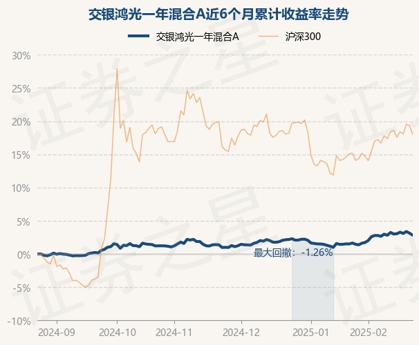 证券之星消息,2月25日,交银鸿光一年混合A最新单位净值为1.0416元,累计净值为1.0416元,较前一交易日下跌0.29%。历史数据显示该基金近1个月上涨1.19%,近3个月上涨1.81%,近6个月上涨2.82%,近1年上涨4.49%。该基金近6个月的累计收益率走势如下图: