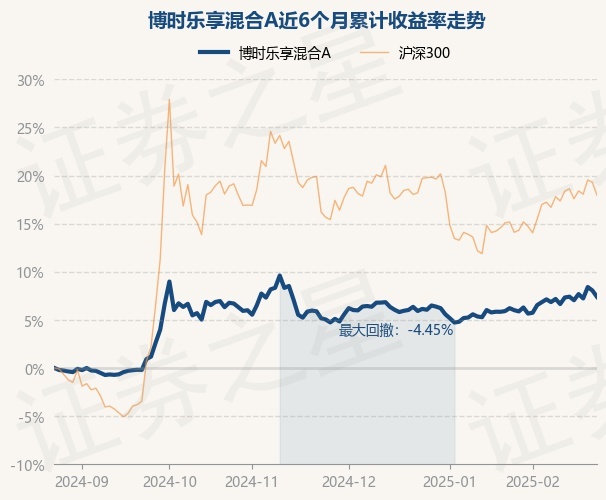 证券之星消息,2月25日,博时乐享混合A最新单位净值为0.9967元,累计净值为0.9967元,较前一交易日下跌0.62%。历史数据显示该基金近1个月上涨1.03%,近3个月上涨2.24%,近6个月上涨7.39%,近1年上涨8.29%。该基金近6个月的累计收益率走势如下图: