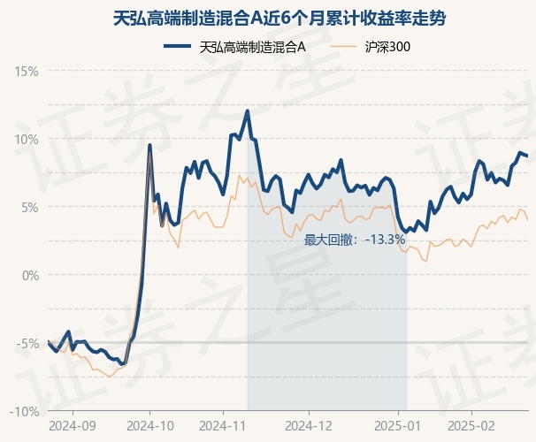 证券之星消息,2月25日,天弘高端制造混合A最新单位净值为0.832元,累计净值为0.832元,较前一交易日下跌0.14%。历史数据显示该基金近1个月上涨4.54%,近3个月上涨6.37%,近6个月上涨27.39%,近1年上涨27.47%。该基金近6个月的累计收益率走势如下图: