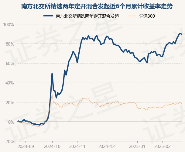 证券之星消息,2月25日,南方北交所精选两年定开混合发起最新单位净值为1.3269元,累计净值为1.3869元,较前一交易日下跌0.72%。历史数据显示该基金近1个月上涨11.93%,近3个月上涨3.34%,近6个月上涨89.27%,近1年上涨59.06%。该基金近6个月的累计收益率走势如下图: