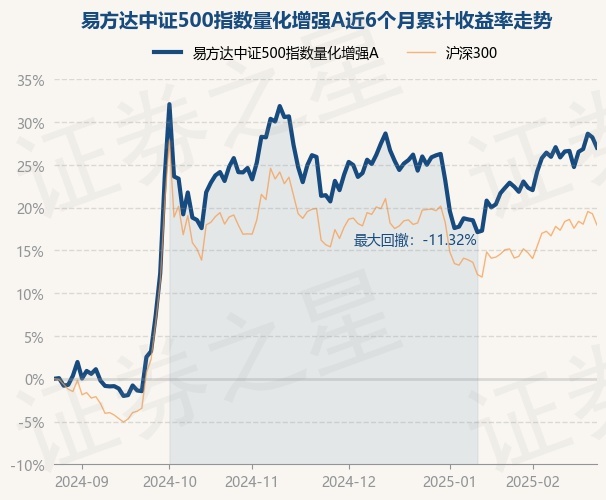 证券之星消息,2月25日,易方达中证500指数量化增强A最新单位净值为0.9353元,累计净值为0.9353元,较前一交易日下跌0.94%。历史数据显示该基金近1个月上涨3.22%,近3个月上涨4.57%,近6个月上涨27.01%,近1年上涨16.82%。该基金近6个月的累计收益率走势如下图: