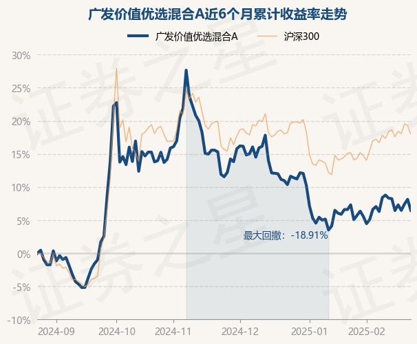 证券之星消息,2月25日,广发价值优选混合A最新单位净值为0.9351元,累计净值为0.9351元,较前一交易日下跌1.55%。历史数据显示该基金近1个月上涨0.11%,近3个月下跌4.55%,近6个月上涨6.47%,近1年上涨4.34%。该基金近6个月的累计收益率走势如下图: