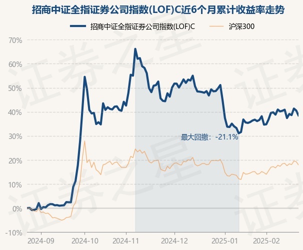 证券之星消息,2月25日,招商中证全指证券公司指数(LOF)C最新单位净值为1.1813元,累计净值为1.1813元,较前一交易日下跌1.44%。历史数据显示该基金近1个月上涨0.26%,近3个月下跌4.17%,近6个月上涨38.54%,近1年上涨22.73%。该基金近6个月的累计收益率走势如下图: