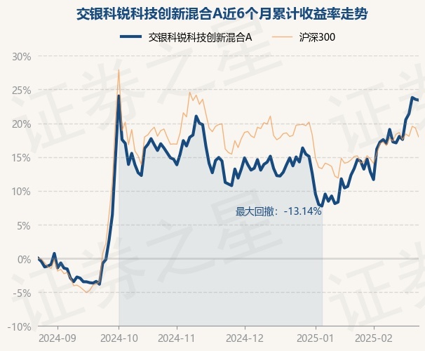 证券之星消息,2月25日,交银科锐科技创新混合A最新单位净值为1.2449元,累计净值为1.2449元,较前一交易日下跌0.1%。历史数据显示该基金近1个月上涨7.6%,近3个月上涨11.18%,近6个月上涨23.42%,近1年上涨18.53%。该基金近6个月的累计收益率走势如下图: