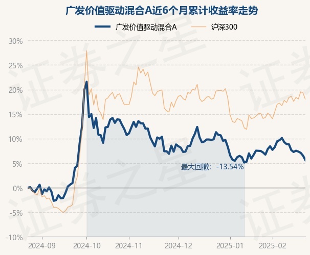 证券之星消息,2月25日,广发价值驱动混合A最新单位净值为0.8564元,累计净值为0.8564元,较前一交易日下跌0.86%。历史数据显示该基金近1个月下跌2.1%,近3个月下跌1.69%,近6个月上涨5.61%,近1年下跌0.41%。该基金近6个月的累计收益率走势如下图: