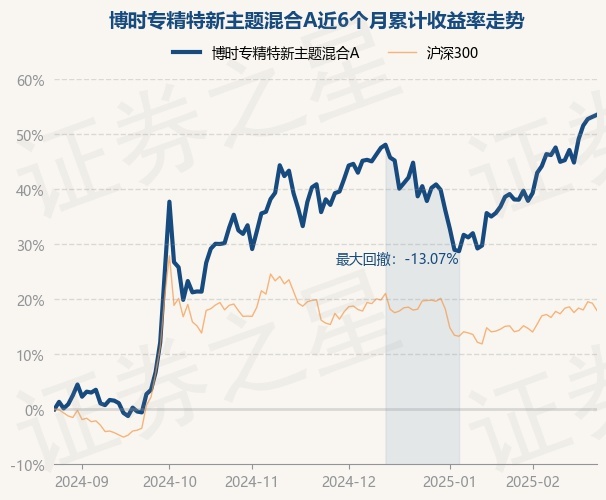 证券之星消息,2月25日,博时专精特新主题混合A最新单位净值为0.9784元,累计净值为0.9784元,较前一交易日上涨0.25%。历史数据显示该基金近1个月上涨9.88%,近3个月上涨11.13%,近6个月上涨53.55%,近1年上涨32.07%。该基金近6个月的累计收益率走势如下图: