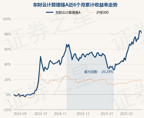 证券之星消息,2月25日,东财云计算增强A最新单位净值为1.2614元,累计净值为1.2614元,较前一交易日下跌1.47%。历史数据显示该基金近1个月上涨22.32%,近3个月上涨23.09%,近6个月上涨81.21%,近1年上涨57.91%。该基金近6个月的累计收益率走势如下图: