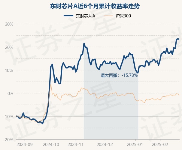 证券之星消息,2月25日,东财芯片A最新单位净值为0.97元,累计净值为0.97元,较前一交易日下跌0.26%。历史数据显示该基金近1个月上涨12.62%,近3个月上涨17.83%,近6个月上涨66.55%,近1年上涨61.45%。该基金近6个月的累计收益率走势如下图: