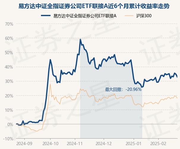 证券之星消息,2月25日,易方达中证全指证券公司ETF联接A最新单位净值为1.1496元,累计净值为1.1496元,较前一交易日下跌1.39%。历史数据显示该基金近1个月上涨0.25%,近3个月下跌4.14%,近6个月上涨32.81%,近1年上涨18.56%。该基金近6个月的累计收益率走势如下图: