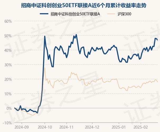 证券之星消息,2月25日,招商中证科创创业50ETF联接A最新单位净值为0.7654元,累计净值为0.7654元,较前一交易日下跌0.61%。历史数据显示该基金近1个月上涨6.97%,近3个月上涨8.24%,近6个月上涨46.88%,近1年上涨35.06%。该基金近6个月的累计收益率走势如下图: