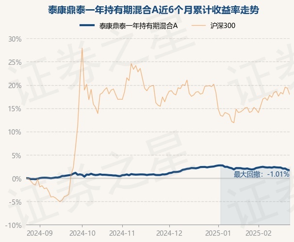 证券之星消息,2月25日,泰康鼎泰一年持有期混合A最新单位净值为1.025元,累计净值为1.025元,较前一交易日下跌0.1%。历史数据显示该基金近1个月下跌0.23%,近3个月上涨1.03%,近6个月上涨1.7%,近1年上涨3.08%。该基金近6个月的累计收益率走势如下图: