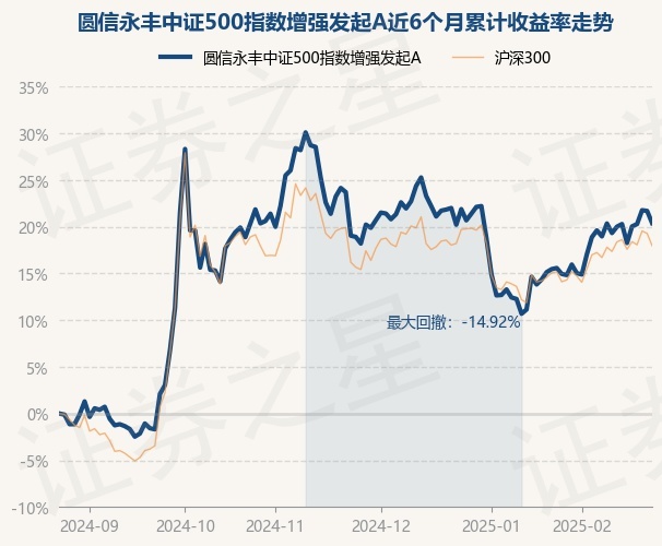 证券之星消息,2月25日,圆信永丰中证500指数增强发起A最新单位净值为0.8137元,累计净值为0.8137元,较前一交易日下跌1.07%。历史数据显示该基金近1个月上涨3.83%,近3个月上涨1.24%,近6个月上涨20.39%,近1年上涨8.46%。该基金近6个月的累计收益率走势如下图: