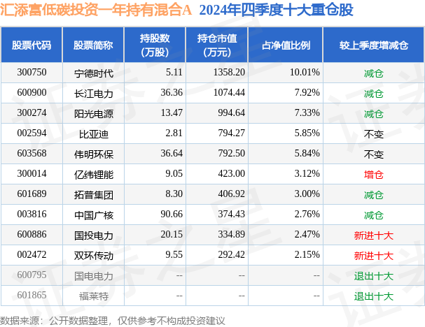 汇添富低碳投资一年持有混合A为混合型-偏股基金,根据最新一期基金季报显示,该基金资产配置:股票占净值比88.07%,无债券类资产,现金占净值比6.29%。基金十大重仓股如下: