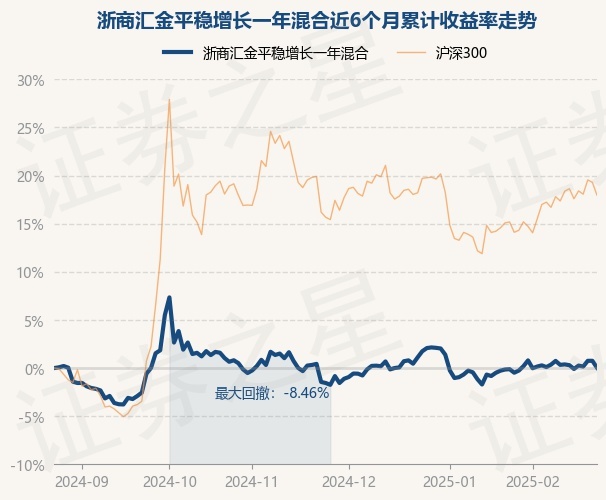 证券之星消息,2月25日,浙商汇金平稳增长一年混合最新单位净值为0.9066元,累计净值为2.4324元,较前一交易日下跌0.71%。历史数据显示该基金近1个月下跌0.15%,近3个月上涨1.61%,近6个月上涨0.03%,近1年上涨0.83%。该基金近6个月的累计收益率走势如下图: