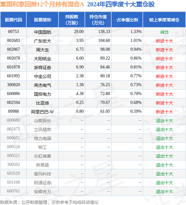 富国利享回报12个月持有混合A为混合型-偏债基金,根据最新一期基金季报显示,该基金资产配置:股票占净值比19.41%,债券占净值比74.91%,现金占净值比6.04%。基金十大重仓股如下:
