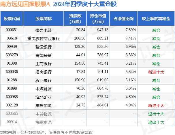 南方远见回报股票A为股票型基金,根据最新一期基金季报显示,该基金资产配置:股票占净值比89.55%,债券占净值比5.01%,现金占净值比2.71%。基金十大重仓股如下: