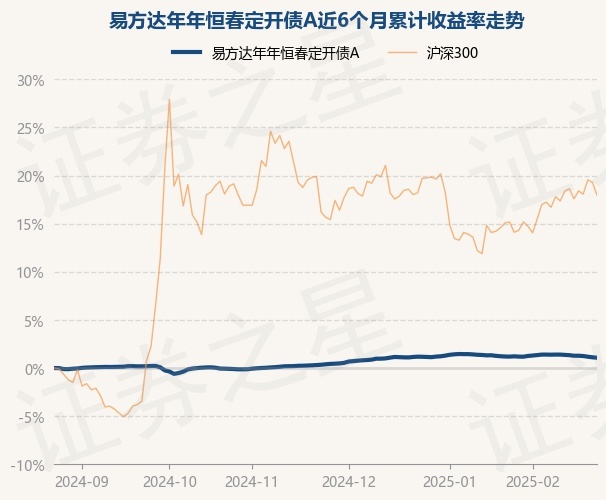 证券之星消息,2月25日,易方达年年恒春定开债A最新单位净值为1.0153元,累计净值为1.149元,较前一交易日下跌0.05%。历史数据显示该基金近1个月下跌0.11%,近3个月上涨0.68%,近6个月上涨1.07%,近1年上涨3.12%。该基金近6个月的累计收益率走势如下图: