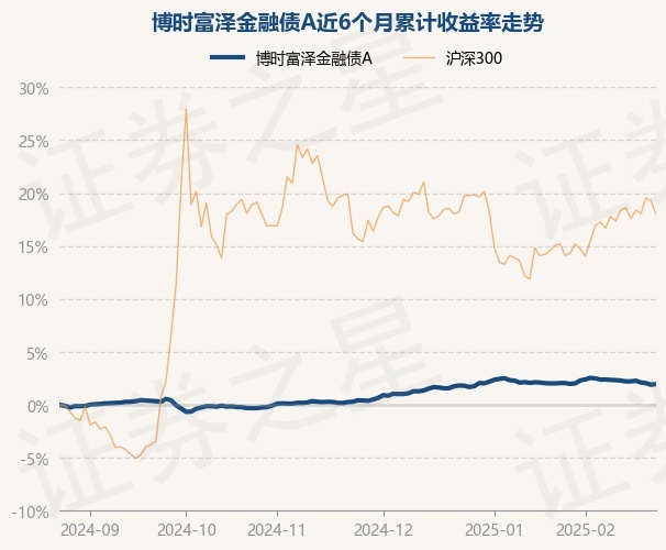 证券之星消息,2月25日,博时富泽金融债A最新单位净值为1.0372元,累计净值为1.092元,较前一交易日上涨0.08%。历史数据显示该基金近1个月下跌0.06%,近3个月上涨1.54%,近6个月上涨1.97%,近1年上涨4.69%。该基金近6个月的累计收益率走势如下图:
