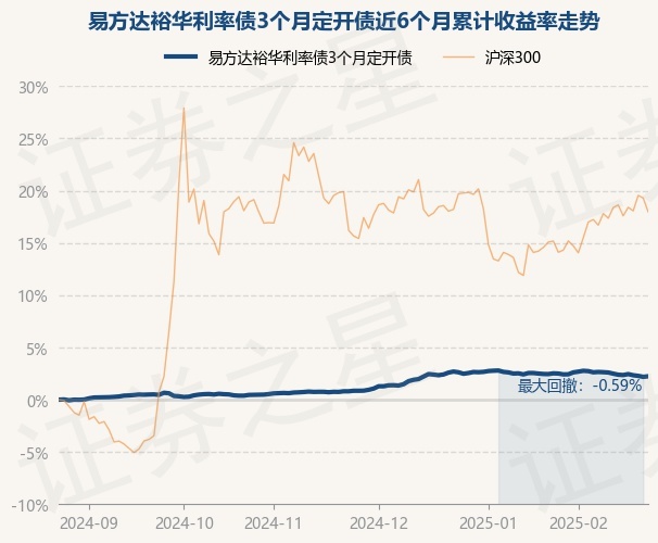 证券之星消息,2月25日,易方达裕华利率债3个月定开债最新单位净值为1.0096元,累计净值为1.1121元,较前一交易日上涨0.05%。历史数据显示该基金近1个月下跌0.19%,近3个月上涨1.37%,近6个月上涨2.24%,近1年上涨4.42%。该基金近6个月的累计收益率走势如下图: