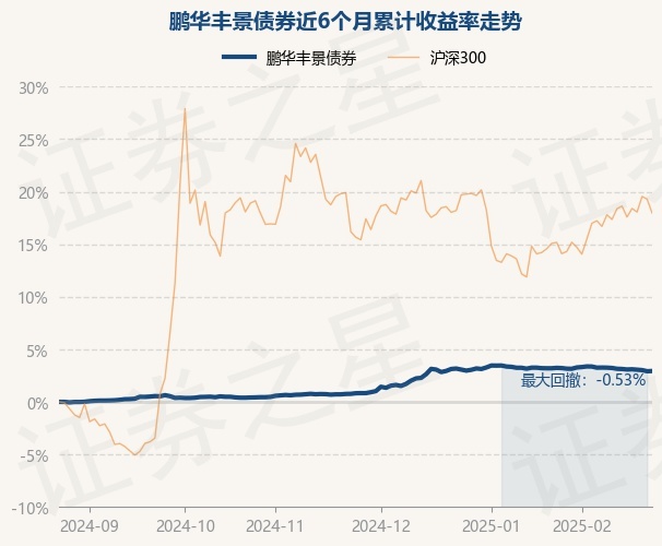 证券之星消息,2月25日,鹏华丰景债券最新单位净值为1.0575元,累计净值为1.0627元,较前一交易日上涨0.02%。历史数据显示该基金近1个月下跌0.21%,近3个月上涨2.09%,近6个月上涨2.94%,近1年上涨5.48%。该基金近6个月的累计收益率走势如下图: