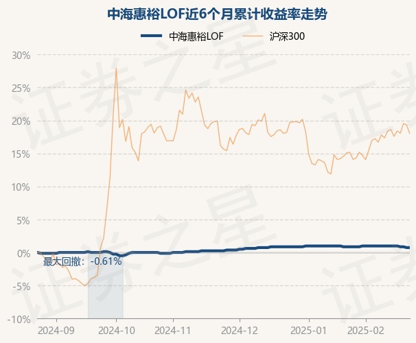 证券之星消息,2月25日,中海惠裕LOF最新单位净值为0.819元,累计净值为1.523元,较前一交易日上涨0.0%。历史数据显示该基金近1个月下跌0.12%,近3个月上涨0.49%,近6个月上涨0.74%,近1年上涨2.5%。该基金近6个月的累计收益率走势如下图: