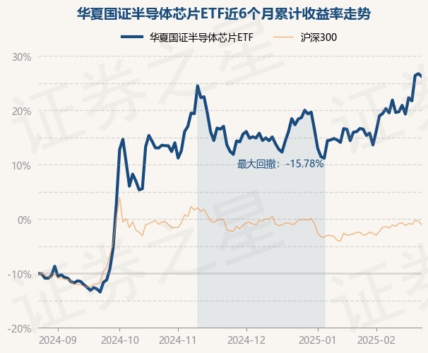 证券之星消息,2月25日,华夏国证半导体芯片ETF最新单位净值为1.3822元,累计净值为1.3822元,较前一交易日下跌0.58%。历史数据显示该基金近1个月上涨13.75%,近3个月上涨19.04%,近6个月上涨72.49%,近1年上涨68.4%。该基金近6个月的累计收益率走势如下图: