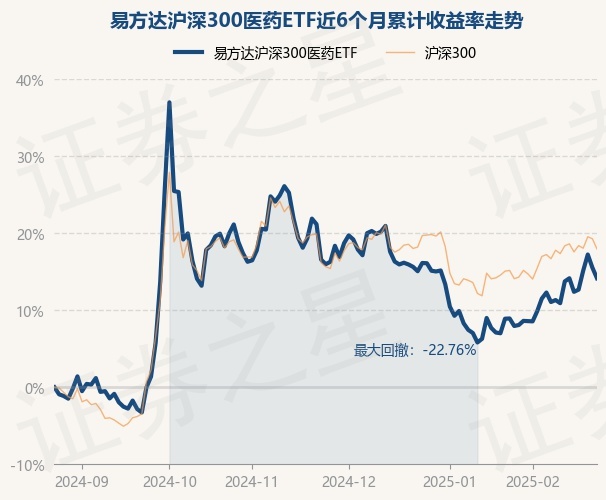 证券之星消息,2月25日,易方达沪深300医药ETF最新单位净值为0.3628元,累计净值为1.4512元,较前一交易日下跌1.2%。历史数据显示该基金近1个月上涨5.1%,近3个月下跌1.57%,近6个月上涨14.16%,近1年下跌3.02%。该基金近6个月的累计收益率走势如下图: