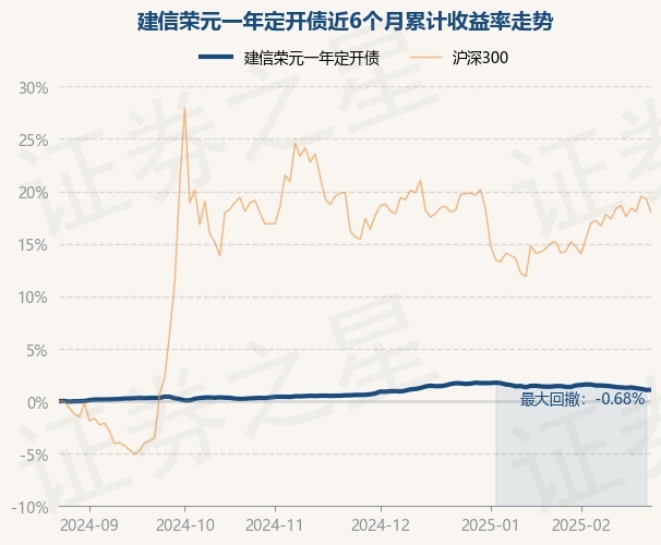 证券之星消息,2月25日,建信荣元一年定开债最新单位净值为1.0892元,累计净值为1.1342元,较前一交易日上涨0.01%。历史数据显示该基金近1个月下跌0.27%,近3个月上涨0.48%,近6个月上涨1.08%,近1年上涨2.84%。该基金近6个月的累计收益率走势如下图: