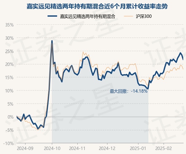 证券之星消息,2月25日,嘉实远见精选两年持有期混合最新单位净值为0.6307元,累计净值为0.6307元,较前一交易日下跌1.35%。历史数据显示该基金近1个月上涨4.56%,近3个月上涨6.68%,近6个月上涨21.73%,近1年上涨10.51%。该基金近6个月的累计收益率走势如下图:
