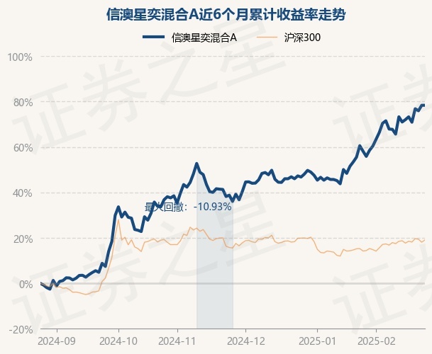 证券之星消息,2月26日,信澳星奕混合A最新单位净值为1.3912元,累计净值为1.3912元,较前一交易日上涨0.0%。历史数据显示该基金近1个月上涨15.22%,近3个月上涨34.26%,近6个月上涨82.67%,近1年上涨70.68%。该基金近6个月的累计收益率走势如下图: