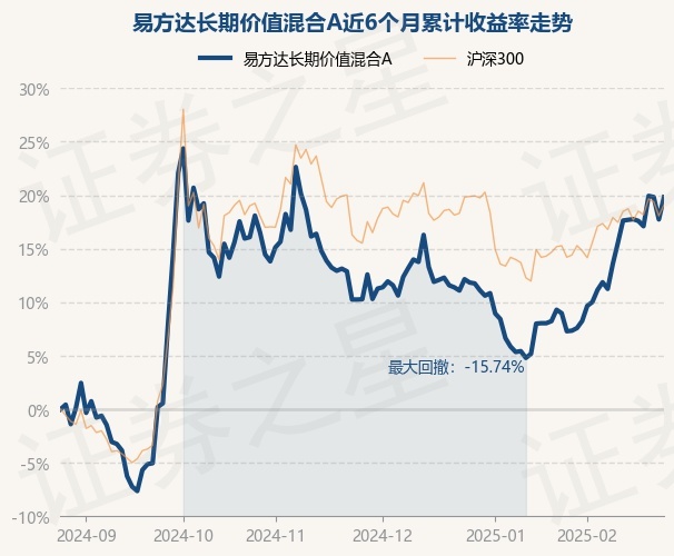 证券之星消息,2月26日,易方达长期价值混合A最新单位净值为0.9269元,累计净值为0.9269元,较前一交易日上涨1.77%。历史数据显示该基金近1个月上涨11.37%,近3个月上涨8.65%,近6个月上涨19.82%,近1年上涨10.85%。该基金近6个月的累计收益率走势如下图: