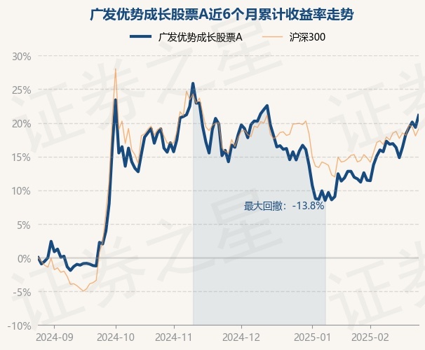 证券之星消息,2月26日,广发优势成长股票A最新单位净值为0.4009元,累计净值为0.4009元,较前一交易日上涨1.49%。历史数据显示该基金近1个月上涨7.57%,近3个月上涨6.03%,近6个月上涨21.12%,近1年上涨4.13%。该基金近6个月的累计收益率走势如下图: