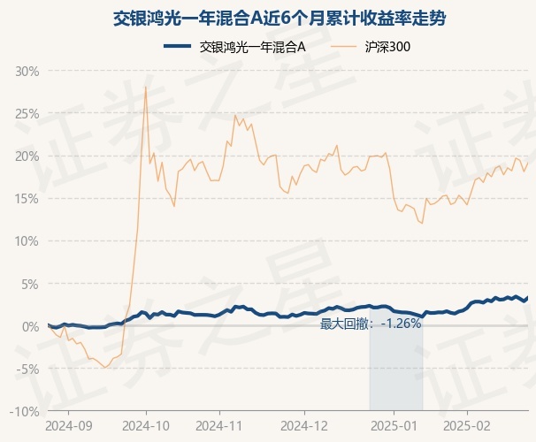 证券之星消息,2月26日,交银鸿光一年混合A最新单位净值为1.0456元,累计净值为1.0456元,较前一交易日上涨0.38%。历史数据显示该基金近1个月上涨1.57%,近3个月上涨2.23%,近6个月上涨3.23%,近1年上涨5.01%。该基金近6个月的累计收益率走势如下图: