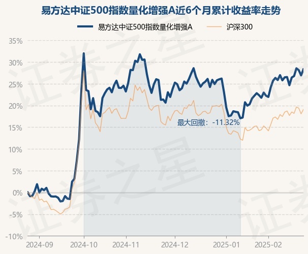 证券之星消息,2月26日,易方达中证500指数量化增强A最新单位净值为0.9455元,累计净值为0.9455元,较前一交易日上涨1.09%。历史数据显示该基金近1个月上涨4.35%,近3个月上涨6.36%,近6个月上涨28.31%,近1年上涨18.14%。该基金近6个月的累计收益率走势如下图: