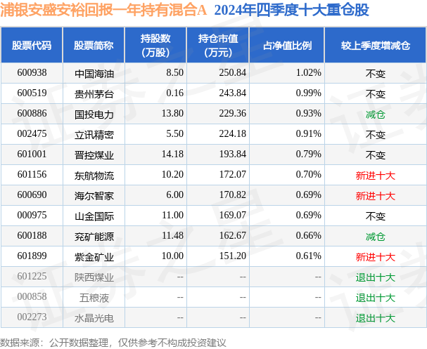 浦银安盛安裕回报一年持有混合A为混合型-偏债基金,根据最新一期基金季报显示,该基金资产配置:股票占净值比22.42%,债券占净值比66.86%,现金占净值比9.3%。基金十大重仓股如下:
