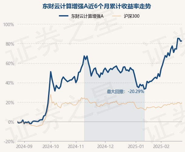 证券之星消息,2月26日,东财云计算增强A最新单位净值为1.2633元,累计净值为1.2633元,较前一交易日上涨0.15%。历史数据显示该基金近1个月上涨22.51%,近3个月上涨25.63%,近6个月上涨82.77%,近1年上涨57.46%。该基金近6个月的累计收益率走势如下图: