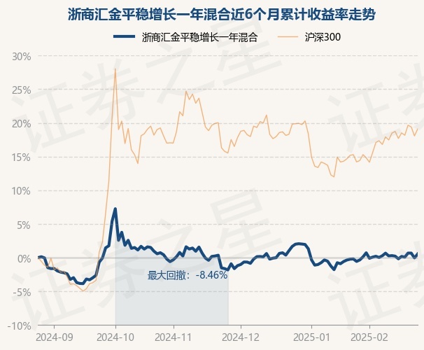 证券之星消息,2月26日,浙商汇金平稳增长一年混合最新单位净值为0.9119元,累计净值为2.4377元,较前一交易日上涨0.58%。历史数据显示该基金近1个月上涨0.43%,近3个月上涨2.4%,近6个月上涨0.54%,近1年上涨1.97%。该基金近6个月的累计收益率走势如下图: