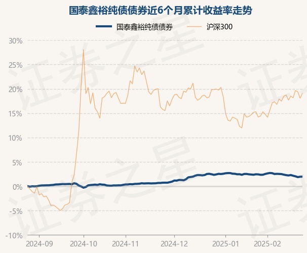 证券之星消息,2月26日,国泰鑫裕纯债债券最新单位净值为1.0463元,累计净值为1.0879元,较前一交易日上涨0.02%。历史数据显示该基金近1个月下跌0.38%,近3个月上涨1.23%,近6个月上涨1.97%,近1年上涨4.08%。该基金近6个月的累计收益率走势如下图: