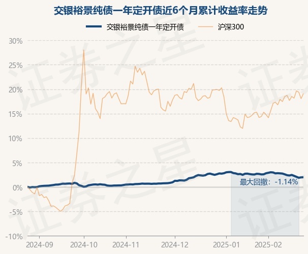 证券之星消息,2月26日,交银裕景纯债一年定开债最新单位净值为1.0431元,累计净值为1.1151元,较前一交易日上涨0.03%。历史数据显示该基金近1个月下跌0.58%,近3个月上涨1.22%,近6个月上涨1.99%,近1年上涨3.73%。该基金近6个月的累计收益率走势如下图: