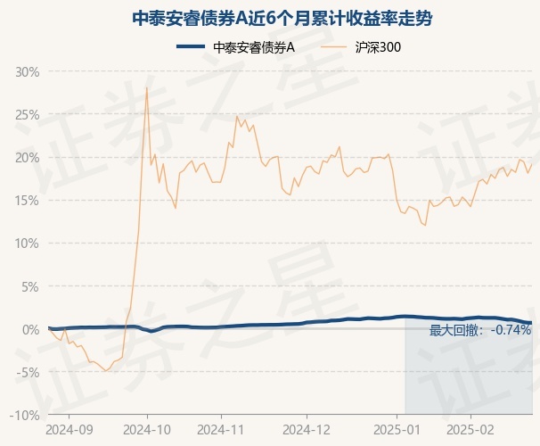 证券之星消息,2月26日,中泰安睿债券A最新单位净值为1.0421元,累计净值为1.0841元,较前一交易日下跌0.01%。历史数据显示该基金近1个月下跌0.42%,近3个月上涨0.16%,近6个月上涨0.64%,近1年上涨2.54%。该基金近6个月的累计收益率走势如下图: