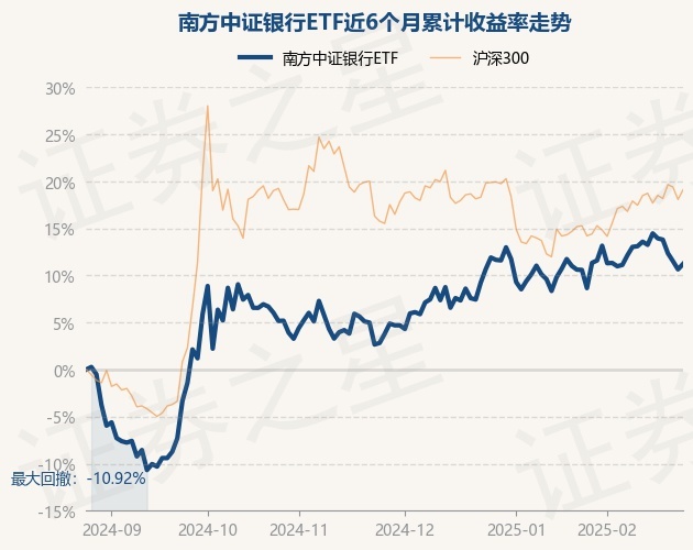 证券之星消息,2月26日,南方中证银行ETF最新单位净值为1.4886元,累计净值为1.6556元,较前一交易日上涨0.51%。历史数据显示该基金近1个月下跌0.34%,近3个月上涨7.15%,近6个月上涨11.21%,近1年上涨27.46%。该基金近6个月的累计收益率走势如下图: