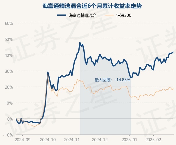 证券之星消息,2月26日,海富通精选混合最新单位净值为0.5631元,累计净值为4.8728元,较前一交易日上涨0.43%。历史数据显示该基金近1个月上涨6.25%,近3个月上涨6.32%,近6个月上涨41.86%,近1年上涨33.21%。该基金近6个月的累计收益率走势如下图: