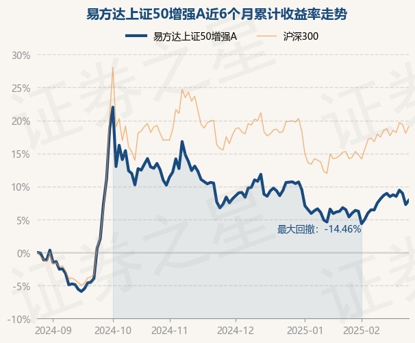 证券之星消息,2月26日,易方达上证50增强A最新单位净值为1.8238元,累计净值为3.8138元,较前一交易日上涨0.61%。历史数据显示该基金近1个月上涨1.44%,近3个月上涨0.55%,近6个月上涨7.91%,近1年上涨4.76%。该基金近6个月的累计收益率走势如下图: