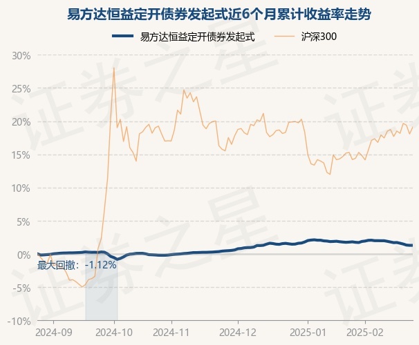 证券之星消息,2月26日,易方达恒益定开债券发起式最新单位净值为1.022元,累计净值为1.302元,较前一交易日上涨0.0%。历史数据显示该基金近1个月下跌0.42%,近3个月上涨0.83%,近6个月上涨1.29%,近1年上涨3.56%。该基金近6个月的累计收益率走势如下图: