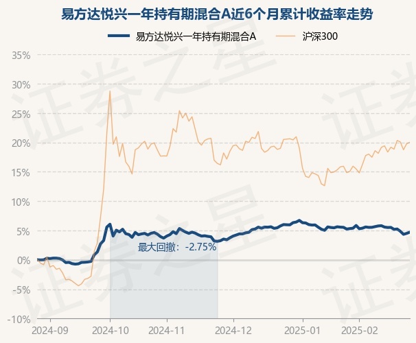 证券之星消息,2月27日,易方达悦兴一年持有期混合A最新单位净值为1.0274元,累计净值为1.0274元,较前一交易日上涨0.2%。历史数据显示该基金近1个月下跌1.08%,近3个月上涨1.13%,近6个月上涨4.71%,近1年上涨5.0%。该基金近6个月的累计收益率走势如下图: