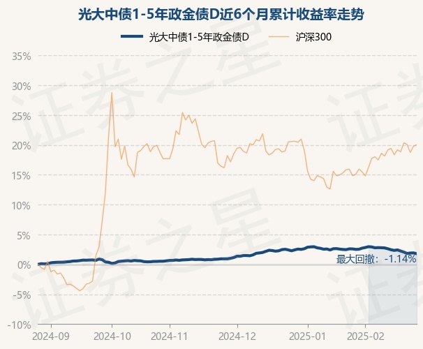 证券之星消息,2月27日,光大中债1-5年政金债D最新单位净值为0.9995元,累计净值为1.112元,较前一交易日下跌0.13%。历史数据显示该基金近1个月下跌0.9%,近3个月上涨0.85%,近6个月上涨1.79%,近1年上涨3.86%。该基金近6个月的累计收益率走势如下图: